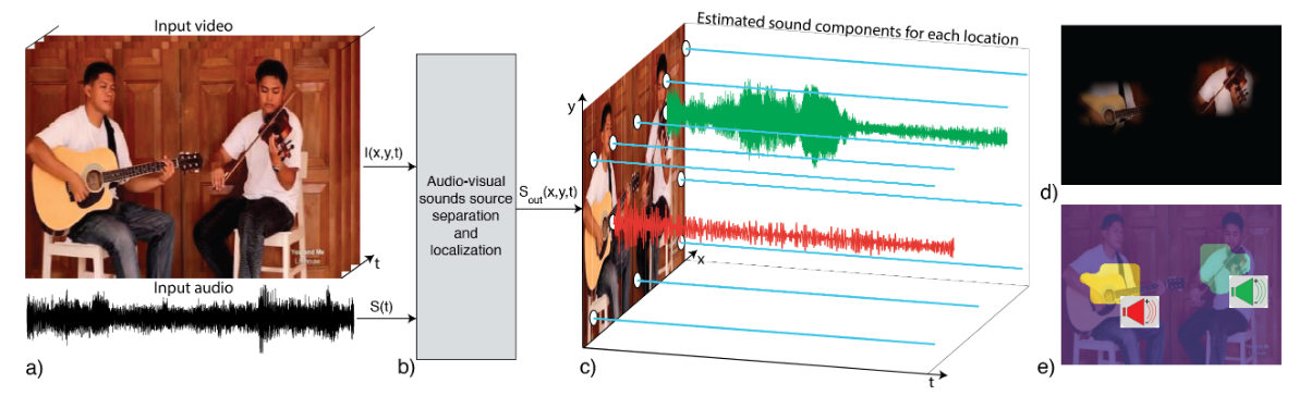 We introduce PixelPlayer, a system that, by leveraging large amounts of unlabeled videos, learns to locate image regions which produce sounds and separate the input sounds into a set of components that represents the sound from each pixel. Our approach capitalizes on the natural synchronization of the visual and audio modalities to learn models that jointly parse sounds and images, without requiring additional manual supervision. Experimental results on a newly collected MUSIC dataset show that our proposed Mix-and-Separate framework outperforms several baselines on source separation. Qualitative results suggest our model learns to ground sounds in vision, enabling applications such as independently adjusting the volume of sound sources.